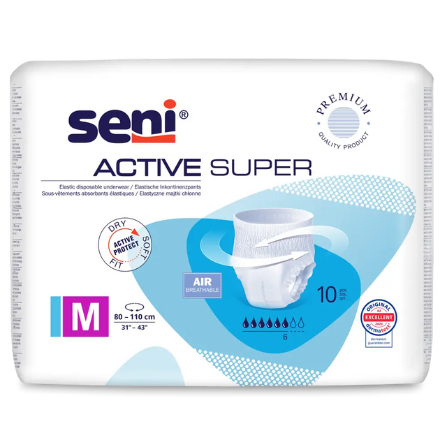 Der atmungsaktive, elastische Inkontinenzslip Seni Active Super ist bei mittlerer bis schwerer Blasenschwäche geeignet.