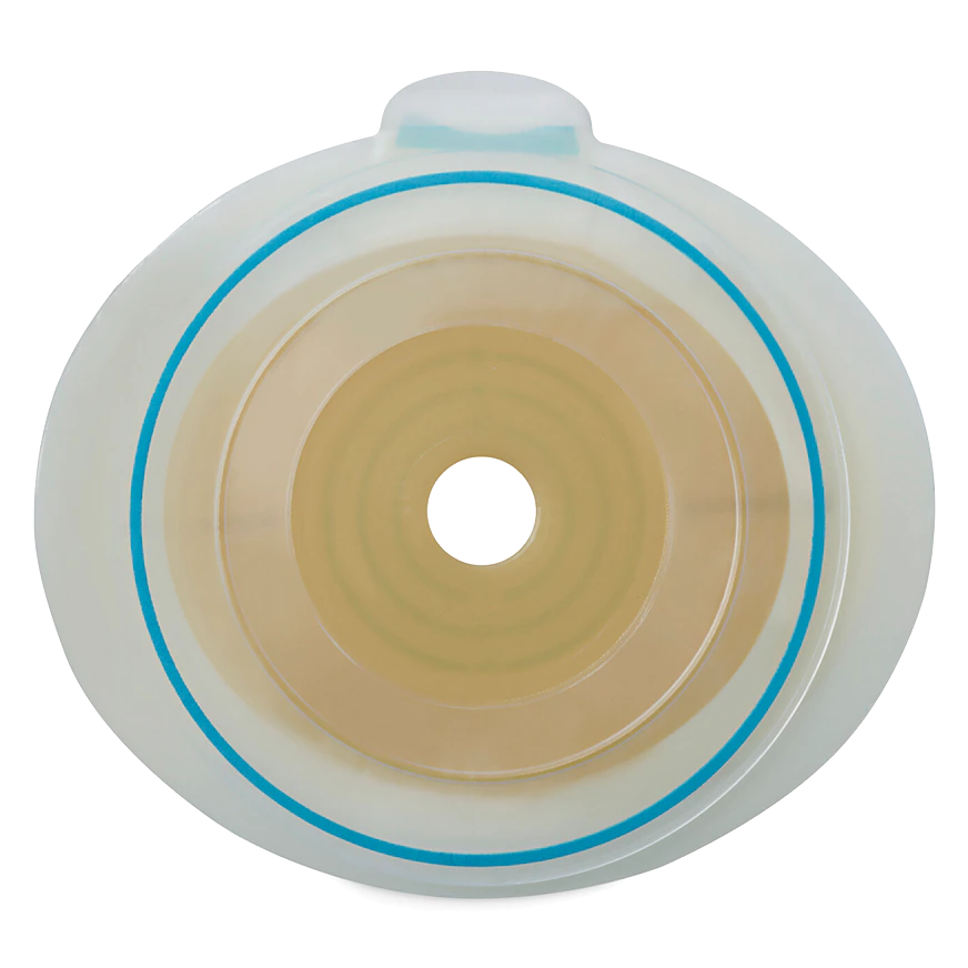 Die Basisplatte gehört zu einer zweiteiligen Versorgung, die es ermöglicht, bei Bedarf nur den Stomabeutel zu wechseln. Der Hautschutz muss nicht jedes Mal neu angebracht werden.