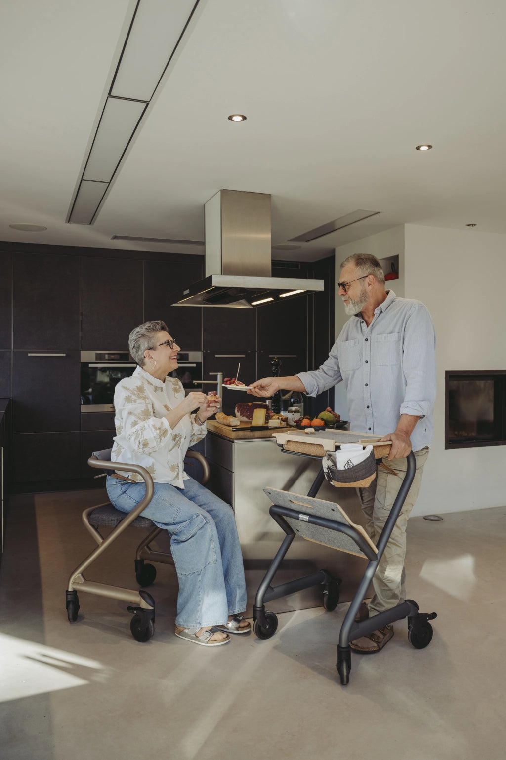 Dank seiner kompakten Maße, der 360°-Drehbarkeit und der hochwertigen Leichtlaufräder bewegt sich der Wohnraumrollator mühelos durch schmale Türen und enge Räume. Selbst im Bad oder über der Toilette ist er ein praktischer Helfer.